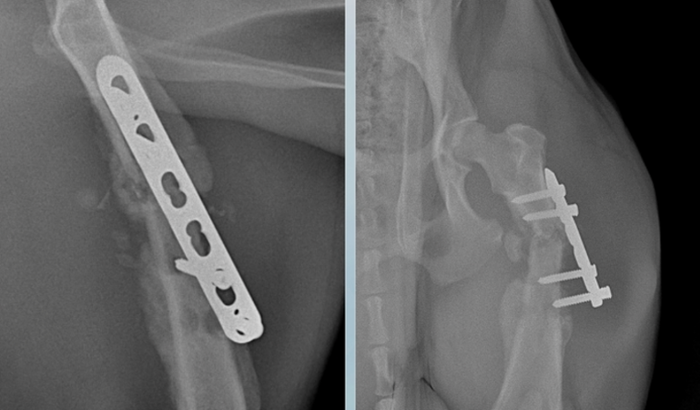 Com passar dos dias notei que começou mancar, levei novamente repetir raio-x, e a placa fez uma nova fratura no local do parafuso, segundo os veterinários excesso de movimentos , mesmo com todo cuidado que tive em manter ele mais preso para recuperação, infelizmente eles não entendem que não pode força, voltou a sentir dor. Está sendo medicado.