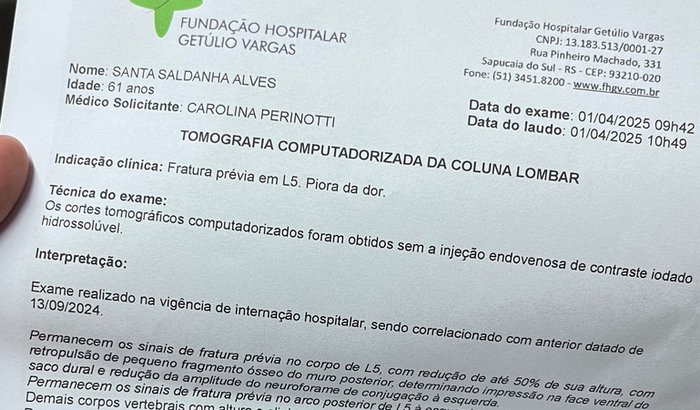 Meu nome é santa, no dia 29/08/2024 um portão de 200kg caiu sobre mim, fui encaminhada ao HGV, e não foi conseguido encaminhamento pro HPS. Estou com a vértebra L5 fraturada, sendo necessária realização de cirurgia que no momento não há disponibilidade pelo sus, gostaria de pedir ajuda para que consiga fazer a cirurgia, porque sinto muitas dores, e não tenho condições para fazer através do particular, agradeço muito a quem puder me ajudar, seja doando, ou compartilhando!