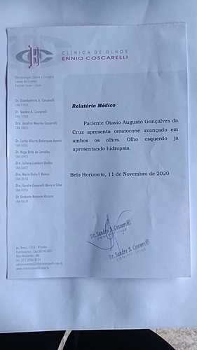 Otávio Augusto Gonçalves da Cruz tem 11 anos, é morador de Mariana, Rua da Cartucha, Beco 3, número 92, e foi diagnosticado em Julho de 2020 com Ceratocone avançado em ambos os olhos. O esquerdo já apresenta hidropsia (ruptura da membrana) . Com isso o Otávio já apresenta perda visual crônica do olho esquerdo onde nota-se um ponto esbranquiçado na córnea.