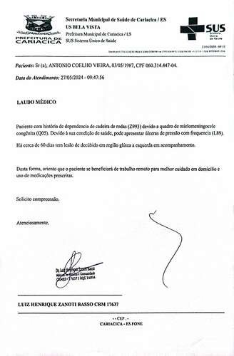 Me chamo Antonio Coelho Vieira, nasci no interior do Estado em uma cidade chamada Iúna, tenho 38 anos e infelizmente nasci com uma patologia chamada de Espinha Bífida. Esta patologia é um defeito congênito, um problema relacionado à maneira como a coluna e a medula espinhal se desenvolvem. A espinha bífida pode começar a se desenvolver no feto antes que a mãe saiba que está grávida. Em alguns casos, as estruturas que devem estar dentro do canal espinhal saem, causando a lesão. Devido ao meu problema de saúde, com sete dias de nascido tive que vim para Vitória capital do Espírito Santo, pois tive que passar por uma cirurgia, a primeira de tantas que fiz durante minha vida. Meus pais vendo que não teria como me criar no interior, pois como as idas e vindas eram constantes, mudamos para Vitória, primeiro veio minha mãe e eu, em seguida meu pai veio de carona em um caminhão de café. No começo nada foi fácil, tivemos que morar de favor na casa de amigos e parentes. Porém na década de 90 meu pai conseguiu um trabalho onde ficou por 30 anos.Desde pequeno sempre fui esforçado, nunca dei importância as dificuldades que surgiam, consegui terminar meu ensino fundamental e médio, no ensino médio como não tinha escola perto de onde morava, minha mãe me empurrava em um percurso de 30 minutos ida e volta para que eu pudesse estudar. Minha mãe, sendo uma mulher guerreira, sempre esteve ao meu lado me apoiando e ajudando. Fiz um curso técnico de nível médio, uma graduação e uma pós graduação, minha força de vencer e poder dar uma condição boa para minha mãe sempre foi inspiração para que eu estudasse. Consegui me inserir no mercado de trabalho, vivo uma vida considerável normal, meu sonho desde pequeno sempre foi ter uma cadeira motorizada, te-la não seria um sinal de luxo, mas sim de necessidade, infelizmente os produtos voltado para as pessoas com deficiência são muito caros e é algo que foge da minha realidade, infelizmente não tinha condições para compra-la porém realizei esse sonho em 2018 criei uma vakinha no qual recebi várias contribuições, hoje em dia preciso de uma cadeira motorizada que deitasse porém não tenho condições financeira para comprar essa cadeira que me traria inúmeros benefícios conforme listado abaixo. Uma cadeira motorizada que reclina da AutoChair oferece diversos benefícios, especialmente para pessoas com necessidades especiais ou que passam muito tempo sentadas. Aqui estão alguns dos principais benefícios: