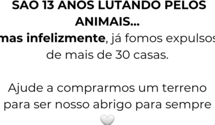 Pessoal, são mais de 13 anos sendo expulsos de casas onde faço de abrigo.Sejam vizinhos, as vezes os próprios donos.Vivemos de um lado para outro, sem ter um local fixo pra viver.Eu não aguento mais viver assim, imagine os animais que ficam sem paz.A vakinha é para comprar um terreno que fique sendo nosso para sempre. ONDE NINGUÉM PODERÁ NOS EXPULSAR.