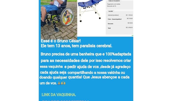 Olá pessoal!estamos aqui mais uma vez pedindo ajudinha de vcs! Bruno precisa de uma banheira, que é 100% adaptada para as necessidades dele,por isso resolvemos criar essa vakinha e pedir mais uma vez a ajuda de todos vcs. 🥰🙏🏻 Desde já, agradeço cada ajuda, seja compartilhando a nossa vakinha ou doando qualquer quantia!! Que Jesus abençoe a cada um de vcs🥰