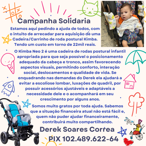 Oi, Sou o Derek Soares Correa, tenho 1 ano 7 meses com diagnóstico clínico encefalopatia crônica não progressiva e microcefalia secundário a malformação da coluna lombossacra (espinha Bífida oculta lombossacra), encefalopatia bilirrubinica no período neonatal (kernicterus) e epilepsia. Condição crônica e permanente. (cid G80, G40, R13, Q76.0)