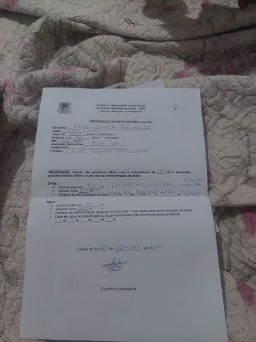 Entao no momento a unica forma de alimentacao dele e pela gastrostomia e infelizmente nao temos condicoes de comprar as meninas da liga Feminina de combate ao cancer nos doaram algumas latas mas ainda precisamos de mais.