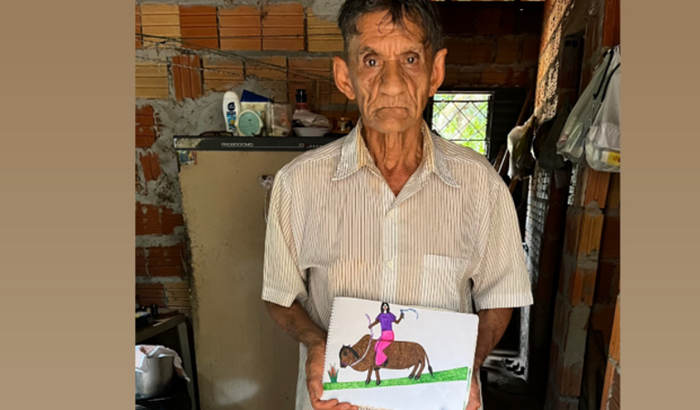 Meu tio se chama Sebastião, tem 83 anos, mora sozinho numa comunidade próximo do município de Poconé, não tem esposa e nem filhos. Ama desenhar, o grande sonho é conseguir vender os seus desenhos. É aposentado e todo mês separa um dinheirinho para comprar caderno de desenho, lápis de cor e canetinhas.