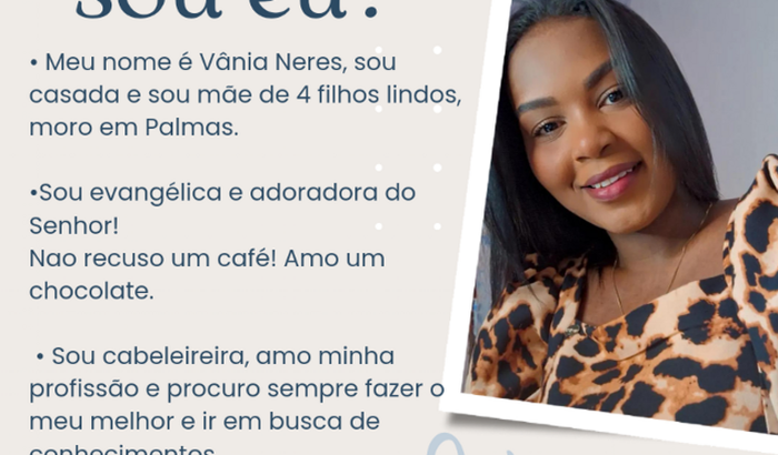 Já faz um tempo que trabalho arrumando cabelos, antes não tinha condiçoes nem de fazer cursos onde eu morava, apos vir pra Palmas eu consegui fazer alguns da minha area inclusive a minha especializaçao. Porem nao tinha cliente o suficiente e sempre me via necessitando de trabalhar de ctl para os outros, mais sendo mae de 4 filhos nao tem condiçoes e os meus sonhos se tornariam cada vez mais distantes tambem. Hoje corro em busca do meu sonhos podendo assim tambem cuida da minha casa e dos meus filhos.