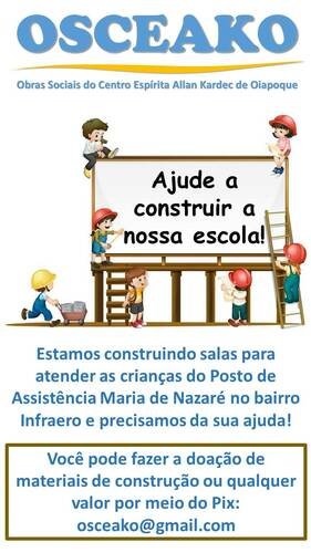 Estamos fazendo essa campanha para a construção de uma sala de aula no posto de assistência do centro espírita, que atenderá com aulas de reforço, cursos e alfabetização de adultos. Desde 2019 o Posto de Assistência Maria de Nazaré atende mais de cem crianças em situação de vulnerabilidade social na periferia da cidade de Oiapoque no Amapá. Conheça mais em https://www.facebook.com/osceako