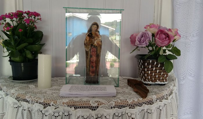 No fim da semana, saímos para visitar uma cunhada na Fazenda Rio Grande, região Metropolitana de Curitiba. Mas eu não estava me sentindo confortável, parecia que não era para estar lá e foi um fim de semana muito angustiante. No domingo, dia primeiro, só almoçamos e já saímos; até parecia estar fugindo. Viemos devagar e às 15:00 horas já estávamos em casa. Depois que descarreguei as bagagens, já ali pelas 16:00 horas, me bateu uma melancolia; sentei na cama e comecei a chorar; chorava feito uma criança e naquele estado permaneci umas duas horas ou até mais. Sandra me perguntava: “Mas o que você tem? Por que você está assim”? Eu nem sabia o porquê e só chorava. Aí ela sugeriu que fosse tomar um banho, pois talvez melhorasse um pouco. Fui e fiquei um bom tempo no chuveiro e até melhorei mesmo! Quando saí do banho recebi um Watsapp da minha sobrinha Jéssica, filha de Bernadete, pedindo se ainda tinha um lugar, porque sua mãe precisava ir também. Interessante que ela tinha dito que não iria; ficaria rezando e intercedendo por nós para que fôssemos bem e tudo desse certo. Aí pensei: Ué, disse que não ia e agora precisa ir? Então, Sabrina que ia mais por curiosidade, desistiu e cedeu o seu lugar. E assim na segunda-feira do dia 02 de janeiro de 2017 embarcamos: eu, Serli, Tainá, Augusto e Bernadete rumo a antiga Agrovila, fazenda que está desativada e faz parte de uma reserva ambiental, pertencente à prefeitura de Irati-PR, cujo imóvel localiza-se no município de Fernandes Pinheiro. Não foi fácil a entrada, pois um senhor, funcionário da prefeitura de Irati, zela do local, visto ser uma propriedade pública. Mas depois de muita conversa chegamos a alguns pontos em comum. Eu conhecia o irmão dele há uns vinte anos atrás, como também a família dele. Aí despertou aquela confiança e nos liberou e, ainda fez algumas recomendações para que tivéssemos cuidado e que fôssemos bem. E assim, nem informamos o motivo da entrada naquele local. Entrando na mata, fizemos uma oração e falei para o Augusto: olha, o ambiente é mais ou menos assim: tem uma árvore grande, uma árvore reta e outra torta, um arroio e um buraco, mas chegando lá eu não sei onde vai estar essa imagem, se está no chão, encima ou do lado da árvore ou se está enterrada, pois isso ela não me revelou. Seguimos em fila um atrás do outro. Eu na frente abrindo a picada com o facão, depois vinha o Augusto; logo atrás Bernadete sempre em oração, em seguida minha filha Tainá fazendo aquele filminho meio perdido, pois tão inocente nem fazia ideia da seriedade que era aquilo! Depois a Serli que caminhava alheia a tudo, pensando que não iríamos encontrar nada. Andamos uns 350 metros e aí percebi já tínhamos andado muito e parei. Devo ter avançado uns dez metros além do alvo. O Augusto parou uns metros antes que eu e, assim cruzou os braços permanecendo no mesmo local. A Bernadete há poucos metros de nós, começou a sentir um perfume de flores e num pequeno espaço ia e voltava e, como alguém que pensa alto dizia: “Mãezinha você está aqui”, e assim repetiu por três vezes: “Mãezinha, eu sei que você está aqui”. E me perguntou se eu não estava sentindo o perfume. Eu disse que não, pois no momento não estava sentindo mesmo. Quando virei para trás, vi atrás do Augusto as duas árvores, uma reta e a outra torta, e disse a ele: Augusto, essas duas árvores atrás de você são as que eu via em meu sonho. Então ele voltando para mim disse: _”E essa árvore grande ali”? Respondi: se estas são as duas, aquela deve ser a árvore grande que eu via também; então eu tinha que avançar uns metros mesmo, pois quando caminhei olhando pra frente não a vi e, ao me voltar para trás pude visualizar melhor e reconhecer que já estava no local de meus sonhos. Em seguida, vi o buraco junto do arroio; era ali que a Senhora havia conversado comigo no último sonho. Aproximei-me e neste momento voltando-me para um toco de imbuia apodrecido comecei a sentir fortemente o perfume de flores. Com o facão fui vasculhando numa das frestas daquele tronco apodrecido. Porém, foi na segunda fresta, enquanto pedaços da madeira apodrecida de terra acumulada iam se desprendendo, a Imagem veio de cima para baixo de uma maneira muito suave. Aí a Serli gritou: “Olá!” e, minha filha num espanto falou alto: “Meu Deus”! Em seguida falei: ‘tinha mesmo!’ demonstrando euforia. E assim o sentimento foi de alívio de alegria. Afinal até nem sei explicar o tamanho da emoção que senti. É algo indescritível. A Bernadete com a voz engasgada pelo choro continuou rezando. Todos ali, muitos emocionados, queriam tocar na Imagem e sentir o seu perfume. Depois Bernadete deu seu testemunho sobre o porquê de ter dito que precisava ir junto. Na noite de sexta-feira para sábado, sonhou que estava rezando, acordou e continuou rezando e assim passou a noite: dormia, acordava e rezava e ainda sentia um perfume de flores que invadia sua casa, sem saber de onde vinha. De sábado para domingo, sentindo o mesmo perfume, sonhou com um tronco de árvore apodrecido e que dele retirava terra para plantar uma muda de orquídea. No entanto, ela não havia correlacionado com o local do meu sonho, era mais uma intuição. E assim entendemos que Bernadete também foi usada para dar uma força e ajudar a desvendar o local da Imagem. O Augusto também testemunhou que quando chegou naquele local, sentiu que era o fim do percurso, que não precisava mais ir para frente e foi por isso que cruzou os braços permanecendo parado. Saindo de lá, voltamos para ver se aquele senhor que vigiava o local ainda estava lá, mas como não havia mais ninguém, assim saímos daquela reserva. No caminho de volta, cada um queria carregar um pouco a Imagem e assim ela vinha repassando de mão em mão, exalando sempre seu perfume. Desde então está aqui conosco. Depois disso muitas coisas veem acontecendo, mas a 