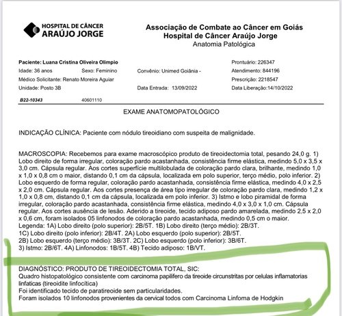 Fui diagnosticada primeiramente com câncer na tireoide, após a cirurgia, o medicou notou linfonodos na cervical e a biópsia deu câncer linfático de Hogkin.