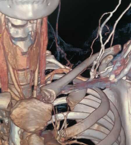 Ao se passarem 3 meses, retornei ao médico com novos exames, já curada da trombose de membro superior, recebi a notícia de uma compressão arterial, mais especificamente Síndrome do Desfiladeiro Torácico. Em exames mais específicos, descobriu-se também uma Costela Cervical, que ajudou para com a compressão da artéria.