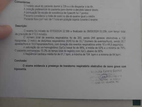 Um exame de polissonografia revelou 380 paradas respiratórias em apenas 7 horas de sono! Isso significa que, a cada minuto por 59 vezes, eu parava de respirar por cerca de 10 a 45 segundos. Imagine o impacto disso na minha saúde e bem-estar!