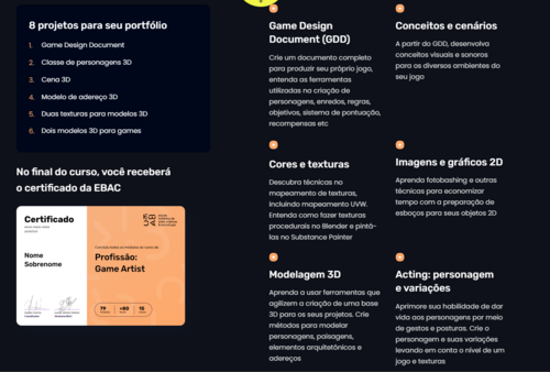 Nos últimos meses, descobri um curso incrível de Game Artist pela ebac, que ensina a criar arte para jogos: cenários, personagens, efeitos visuais... tudo aquilo que faz um game ser mágico. Vi ali uma oportunidade real de entrar na área de desenvolvimento de games e transformar meu sonho em profissão.
