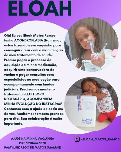 Olá! Eu sou Pamyluik Rego de Matos, mãe da Eloah Matos Ramos. A Eloah é portadora de ACONDROPLASIA, o tipo mais comum de Nanismo. O único tratamento disponivel para essa condição é a medicação VOXZOGO, medicamento importado e de alto custo. Estamos fazendo essa vaquinha para ajudar na manutenção do tratamento de saude dela, pois a recebemos a medicação via judicial e precisamos arcar com todos os exames e consultas e terapias necessárias para otimizar o tratamento. Contamos com a colaboração de todos vcs. Ajude-nos a conseguir arcar com todos esses custos. Vamos juntos conseguir essa vitória na vida da nossa pequena gigante.