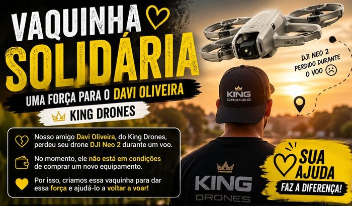 🚁 Vaquinha solidária – Força pro Davi (King Drones)Galera, hoje o post é diferente… é sobre ajudar um amigo 🙏O nosso amigo Davi Oliveira, do King Drones, acabou perdendo o drone dele durante um voo com o DJI Neo 2. Quem vive isso sabe o quanto dói — não é só o equipamento, é trabalho, dedicação e vários planos que vão junto…No momento, ele não está em condições de investir em outro drone. E foi por isso que a gente decidiu se unir e criar essa vaquinha pra dar uma força de verdade pra ele voltar a voar o quanto antes.Se você puder contribuir com qualquer valor, já ajuda demais. De verdade.E se não puder, compartilhar já faz uma diferença enorme 🙌Vamos juntos fortalecer quem faz parte da nossa caminhada 🚀Obrigado de coração a todo mundo que puder ajudar 💛