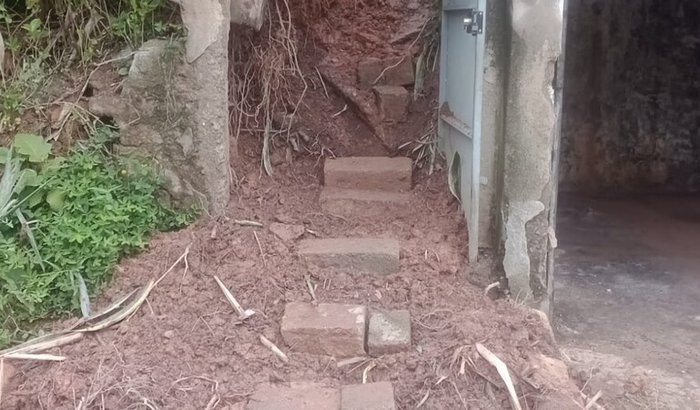 Na madrugada de 17/01/2026, o terreno em frente à entrada deslizou, levando consigo a escada de acesso, o quadro de luz, o cavalete de água, parte do muro lateral e até um poste de iluminação. Essa terra acumulada deixou a passagem totalmente obstruída.