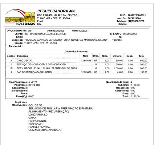 Segue abaixo o orçamento que ele fez para consertar o seu carro e voltar às suas atividades: