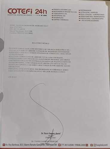 Há 1 ano fiz uma cirurgia bariátrica, e vim ter uma complicação decorrente dessa cirurgia, sou motorista de caminhão e estava em viagem na Bahia, quando comecei a passar mal na quarta-feira (05/07/2023) fui a Upa onde fui medicado mas não tive melhora no meu quadro, na sexta-feira (07/07/2023) retornei a Upa onde novamente só recebi medicamentos para dor, então resolvi procurar por um hospital particular onde fiz exames de sangue, ultrassom e uma ressonância, onde foi confirmado que se tratava de uma torção intestinal e no estômago, então orientado pelos médicos retornei a minha cidade para fazer a cirurgia, devido a gravidade fui obrigado a vir de avião tendo também custos altos de passagens aéreas compradas de última hora.