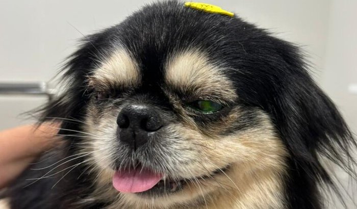 Hoje, pela manhã, quando fui buscar ele, mais um susto, o olho dele estava esbranquiçado e um deles, colado, ela examinou, pingou um colírio especifico e reagiu da pior maneira, suspeita de ulcera em ambos os olhos, já teria que começar o tratamento e ver a evolução.