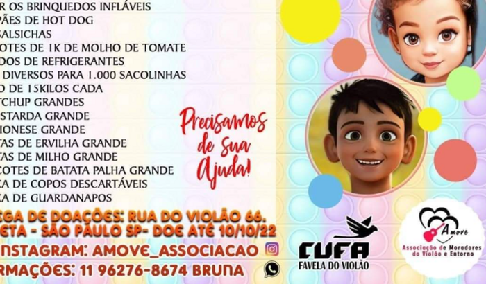 Sou Bruna Rodrigues, estou realizando essa vakinha para nosso Projeto do Dia das Crianças, onde iremos atender 1.000 crianças da Comunidade do Violão e Entorno com entrega de Brinquedos, Lanches e Brincadeiras. Realizaremos no dia 15/10/2022 um dia inteiro com Brinquedos Infláveis, Lanches, Pipoca, Refrigerantes, entrega de Brinquedos e será esperadas 1.000 crianças e preciso muito da sua ajuda para conseguirmos realizar esse evento.Toda ajuda é bem vinda. Faça sua contribuição!