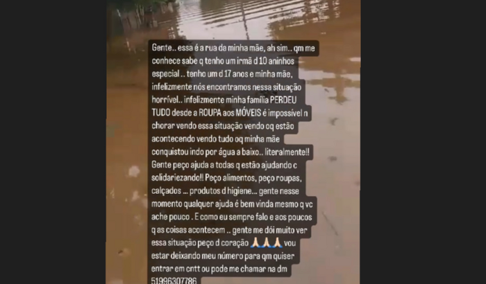 Gente não tem como por foto aqui n consegui, Nsei mexer muito nisso.. todos nós sabemos e estamos vendo as tragedias q estao ocorrendo aqui no Rs, nunca imaginei q estaria passando por essa situação, nunca imaginei ver minha família passando por essa situação… minha mãe mora na santos dumont lá alagou tudo as casas d baixo da água, infelizmente nos encontramos nessa situação onde minha família perdeu tudo, roupa, sapatos, alimentos, produtos d higiene, móveis tudo, é muito triste ver minha mãe perdendo tudo as coisinhas dela, minha mãe e uma mulher guerreira q sempre criou a gente sozinha, qm me conhece sabe eu tenho um irmão d dez anos especial, ele tem autismo, paralisia cerebral q afetou o lado direito da locomoção motora , tem epilepsia e toma medicamentos pra isso, minha mãe e cardíaca tem problemas no coração e toma medicamentos tmb! Tenho mais um irmão d 17 anos … venho carecidamente aqui pedir doação, de comida, de roupa, sapatos, higienie até mesmo móveis toda ajuda é bem vinda você pode me ajudar até mesmo divulgando.. desde já agradeço q deus nos proteja e proteja as famílias aqui do sul!!!