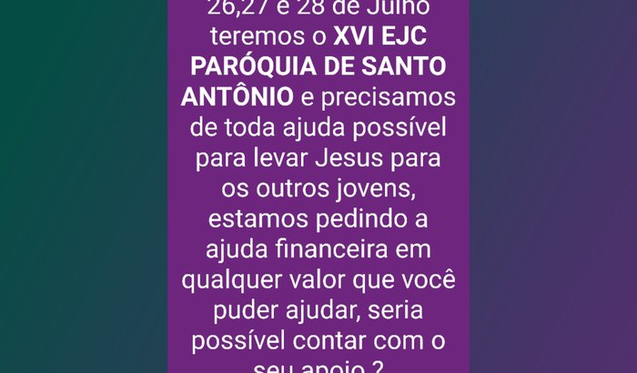 O EJC (Encontro de jovens com Cristo) é um movimento que vem crescendo muito a cada dia, o mesmo ajuda milhares de jovens, em relação com a família, tira jovens de caminhos errados e também ajuda em outros contextos! Mas como muitos já sabem é de doações que este movimento vive e é disso que se trata esse post! Para pedir sua ajuda, você mesmo que leu está mensagem até aqui! Ajude como puder uma doação em qualquer valor ... Se não poder doar ajude simplesmente compartilhando essa mensagem! Se não hoje quem sabe amanhã não é a sua vida ou de algum ente-querido que vai mudar para melhor graças a esse movimento? Desde já Deus lhe abençoe e te dê em dobro... Segue abaixo uma conta disponível para depósito, qualquer coisa me chame no PV Agência: 0111 Op: 013 Conta: 00027707-5 Caixa Econômica (Késsia Rodrigues Ferreira)