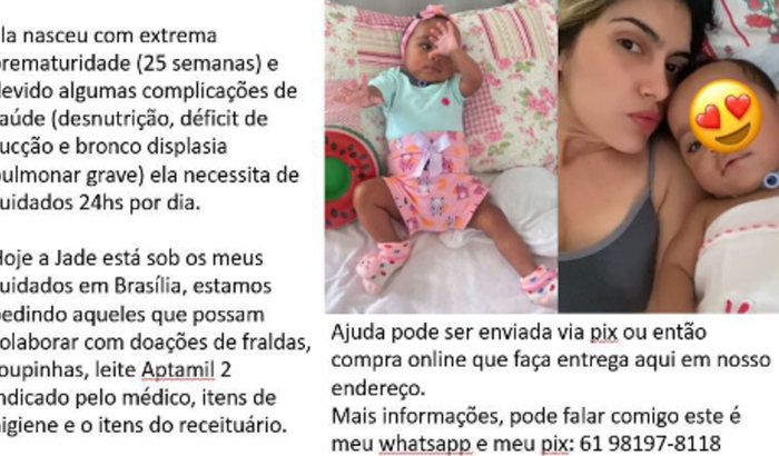 Hoje a Jade está sob os cuidados da Ana em Brasilia, estamos pedindo aqueles que possam colaborar com doações de fraldas, roupinhas, leite indicado pelo médico, e o itens do receituário.
