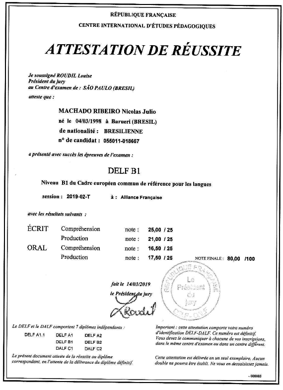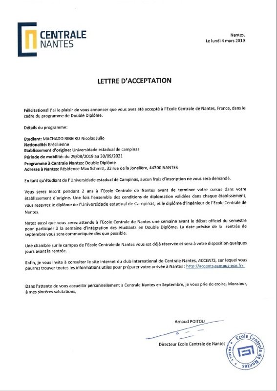 Pessoal, fui aprovado para fazer dupla diplomação na França pela École Centrale de Nantes. Isso foi um sonho que desde muito cedo eu trabalhei para tornar realidade e agora que eu tenho a carta de aceite da universidade francesa nas mãos não vou deixar passar essa oportunidade! Como dito no vídeo, venho de escola pública e, depois de superar algumas dificuldades financeiras para conseguir fazer cursinho, fui aprovado na UNICAMP. Desde então priorizei boas notas. Entrei em um curso de francês no meu primeiro semestre dado pelo Instituto de Economia da minha universidade. Hoje sou certificado no nível B1 da língua. Sempre dando o meu melhor. Sempre tentando me superar. Tudo isso e mais umas gotas de suor e lágrimas (algumas doses de café também) para que eu pudesse alcançar esse objetivo de vida de intercâmbio de dupla diplomação. Então, como já dizia aquele famoso ditado de "pequenas ideias, grandes negócios", se você puder me dar uma força, por menor que ela seja, será uma grande mudança no meu sonho. Logo abaixo mostro minha carta de aceite e a minha certificação no nível B1 da língua francesa.