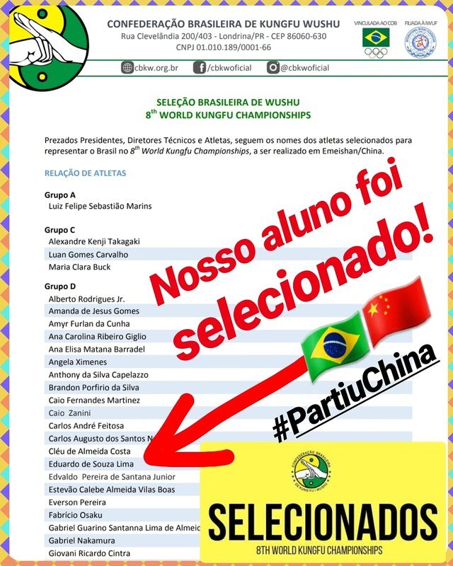 Para chegar até aqui passei por seletivas regionais, campeonatos estaduais e nacional. Com isso, pude ser convidado à participar dos treinos da Seleção Brasileira de Kung Fu, no qual passei por 3 peneiras. Consegui passar por todas elas e com isso, fui convocado para defender o Brasil, representando nosso esporte no maior evento de Kung Fu do mundo!