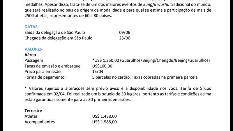 • Terrestre (inscrição, translados): USD 1.488