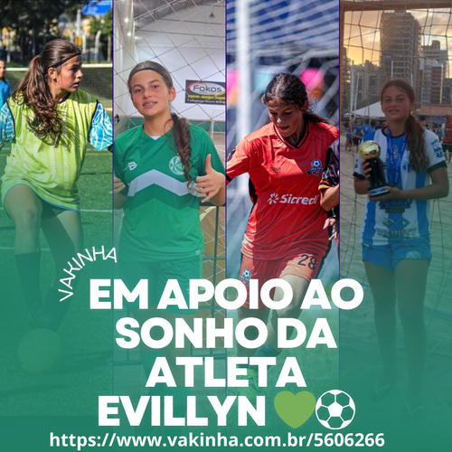 Olá, amigos e amigas! Venho convidar você a fazer parte de um sonho que está se tornando realidade. A jovem Evillyn Godinho Selau, atleta dedicada e moradora de Três Cachoeiras, deu mais um passo em direção ao seu futuro no futebol. Com garra e talento, Evillyn se destacou como volante da Escola de Futebol Mar Azul, e agora foi acolhida pelas categorias de base femininas do Esporte Clube Juventude, tradicional clube da Serra Gaúcha. Em 2025, ela disputará o Gauchão Sub-15 pela equipe de Caxias do Sul. Para que esse sonho siga firme, estamos organizando essa vaquinha solidária com o objetivo de ajudar nos custos com transporte, alimentação,  hospedagem e demais despesas que surgem nesse novo desafio, pois sabemos que existe muitos gastos. A sua contribuição é uma forma real de transformar uma história. Com um simples gesto, você se torna parte dessa trajetória de superação, dedicação e amor ao esporte. Apoiar a Evillyn é acreditar que o talento e a força de vontade podem vencer qualquer obstáculo. Contamos com você para que ela continue representando o futebol feminino e todos que sonham alto! Compartilhe e apoie esse projeto de vida. Juntos, somos parte dessa conquista!