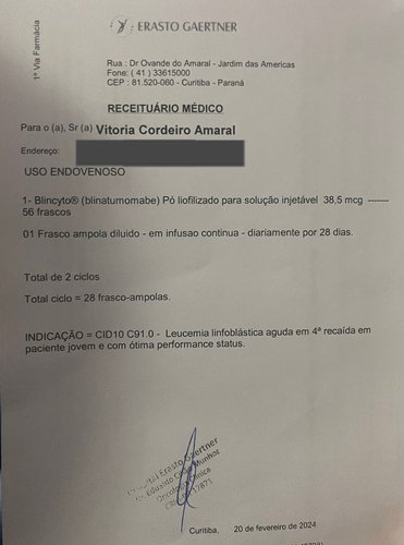 Paciente Vitoria Cordeiro Amaral, 24 anos, portadora de leucemia linfoblástica agudad pré B, Ph negativo com diagnóstico em 2017. Foi inicialmente submetida à protocolo pediátrico permanecendo em resposta completa de doença até agosto de 2022 quando apresentou primeira recaída com surgimento de cloroma em C5-C6. Foi submetida à segunda linha com protocolo HEG-ALL atingindo DRM negativa em novembro de 2022. Havia planejamento de consolidar com transplante haploidêntico com mãe, porém teve atraso devido COVID de paciente e doadora. Paciente apresentou recaída em fevereiro de 2023 com 89% de blastos em MO, foi submetida à resgate com esquema MEC em fevereiro de 2023 atingindo RC com DRM positiva (0,05% de blastos em MO) consolidando com transplante haploidêntico em março de 2023. Após transplante apresentou reativação de citomegalovírus sendo submetida à tratamento preemptivo, houve surgimento de DECHc em boca, fígado e hematológico em vigência de corticoterapia desde julho de 2023. Paciente apresentando surgimento de massa em mama esquerda nos últimos meses, foi submetida à biópsia que demonstrou recaída de doença (anexo laudo), submetida à estadiamento por PET-CT que demonstrou doença em mama esquerda e linfonodomegalia em cadeia axilar esquerda (anexo laudo). Atualmente possui quimerismo 100%, biópsia de medula óssea com DRM negativa, porém documentada nova recaida.