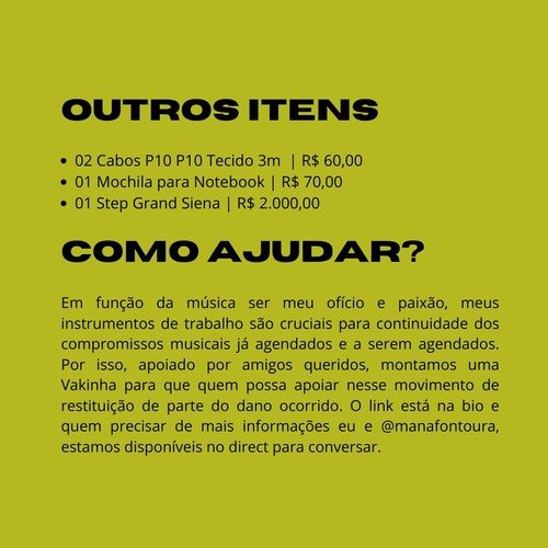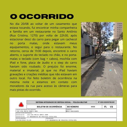 Dudu Amendoeira, grande amigo, músico, cantor e compositor foi furtado na madrugada do dia 20/08/2022 perdendo seus equipamentos de trabalho placa de áudio, teclado e ipad. Um prejuízo estimado de 14 mil reais. Sabemos que é difícil atingir essa meta, mas tentaremos ajudar pelo menos com parte disso!