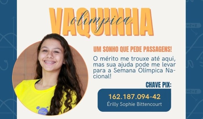 Eu sou Érilly, cursei agora o 8º ano e sou apaixonada pelas Olimpíadas de Conhecimento. Tive a grande honra de ser convidada para a Semana Olímpica Nacional pelas medalhas que recebi na OBM e na TM². Esse convite é o sonho de qualquer olímpico, pois é a honraria máxima: uma semana de aulas preparatórias, dinâmicas, convivência com os melhores professores e medalhistas, uma imersão de conhecimento e excelência.