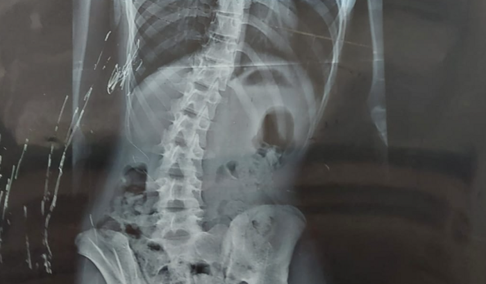 Ela tem 14 anos, está afastada da escola, pois, sem o colete e as fisioterapias e a natação, ela não consegue se locomover, sente dor ao caminhar.