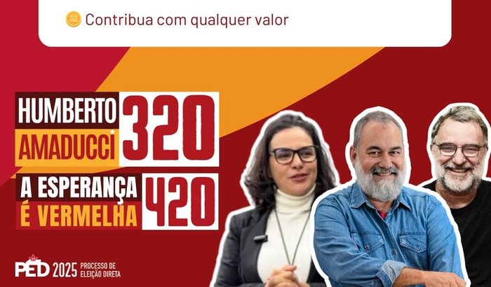 Campanha de arrecadação militante para financiamento da campanha estadual da Chapa Esperança Vermelha 420 e da candidatura Humberto Amaducci 320 - ao PED 2025 do Partido dos Trabalhadores em MS. ver tudo