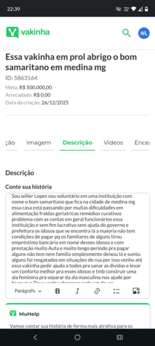 Sou willer Lopes sou voluntário em uma instituição com nome o bom samaritano que fica na cidade de medina mg essa casa está passando por muitas dificuldades em alimentação fraldas geriatricas remédios curativos problema com as contas em geral funcionários essa instituição e sem fim lucrativo sem ajuda do governo e prefeitura os idosos que se encontra lá a maioria não tem condições de pagar pq os familiares de alguns tirou empréstimo bancário em nome desses idosos e com prestação muito Auta e muito longo período pra pagar alguns não tem nem família simplesmente deixou lá e sumiu alguns foi resgatados em situações de rua por isso venho até essa vakinha pedir ajuda a todos pra sanar as dividas e levar um conforto melhor pra esses idosos e tmb construir uma ala feminina pra separar da ala masculino nos ajude por favor que Deus venha abençoar cada um de vcs