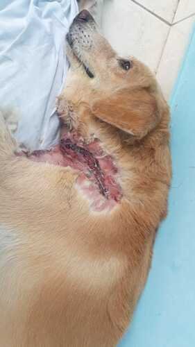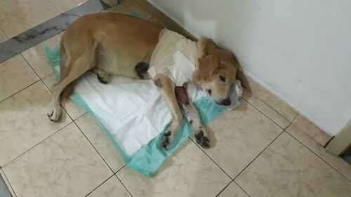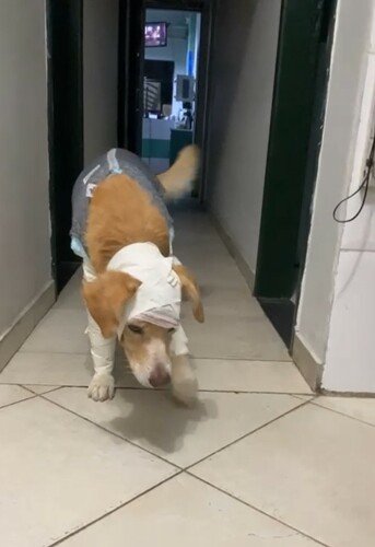 Eu estou melhorando e me recuperando. Os veterinários me elogiam muito. Depois de passar por intervenção para retirada da pele necrosada (apodrecida) fiquei melhor. Recebi um coquetel de medicação para dor, antibiótico e anti-inflamatório intravenoso! Eles trocavam meus curativos duas vezes ao dia e eu não reclamava. Uso até roupa pós-cirúrgica até hoje!