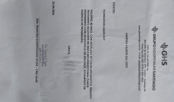 • Olá, eu sou Vanessa Valente Dal Osto, tenho 40 anos e estou enfrentando uma batalha intensa contra o câncer.Tudo começou com um tumor no intestino. Desde então, já passei por três cirurgias de grande porte. A segunda foi nas trompas, e a terceira — realizada no dia 03 de março deste ano — foi extremamente delicada, envolvendo a retirada do útero, ovário, peritônio, baço, parte do fígado, além de partes do intestino delgado e do intestino grosso.No dia 19 de março, fiz uma nova ressonância. Apesar do fígado ter se regenerado, infelizmente foram identificados múltiplos nódulos, indicando que a doença segue ativa e em progressão.De acordo com a médica, meu caso é um câncer de cólon com carcinomatose, em estágio 4, extremamente agressivo. Já realizei 24 sessões de quimioterapia, e realizei a quimioterapia HIPEC (Quimioterapia Intraperitonial Hipertérmica) com infusão de quimioterapia aquecida diretamente na cavidade abdominal, foi realizada junto na última cirurgia, mas, infelizmente, o tratamento não teve o efeito esperado até o momento.Agora, preciso realizar com urgência o exame FOUNDATION LIQUID ACT esse exame só tem clínicas especializadas em São Paulo, o material de coleta bem todo de lá para um laboratório referência deles em Porto Alegre, que é fundamental para identificar a medicação correta para o meu tratamento. Esse exame permitirá que meu caso seja analisado fora do país, trazendo a esperança de encontrar uma terapia específica capaz de agir contra o tumor e conter o avanço da doença.Neste momento, minha luta é para interromper a progressão do câncer e ter uma nova chance de tratamento eficaz.Por isso, peço a sua ajuda. Qualquer contribuição faz diferença. E, se não puder ajudar financeiramente, peço que compartilhe essa mensagem — ela pode chegar a alguém que possa estender a mão.Mais uma vez, agradeço de coração a cada pessoa que puder contribuir com essa corrente de esperança.Obs: Vai ser apresentado nota fiscal do exame e despesas. Esse valor é para o exame que custa em média R$ 14.850,00 e mais os custos até Porto Alegre e ainda temos os descontos da vaquinha. Por esse motivo foi pedido os 18 mil.
