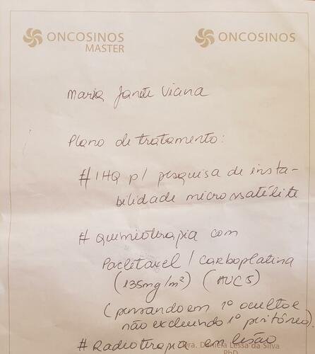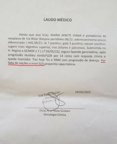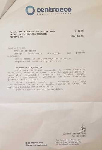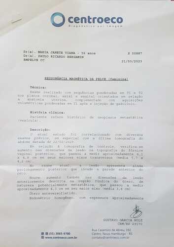 Recentemente, mesmo os meus exames de rotina (Hemograma) mostrando que meu organismo mantinha uma boa condição, me permitindo uma certa qualidade de vida, tive a triste avaliação de que o útero também foi afetado e como sabemos no SUS não temos muitas opções e com a progressão da doença foi orientado, em laudo médico, buscar recursos na rede particular, pois o SUS não teria mais recursos para me oferecer.