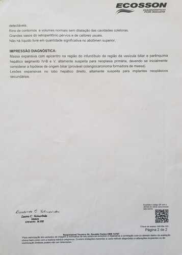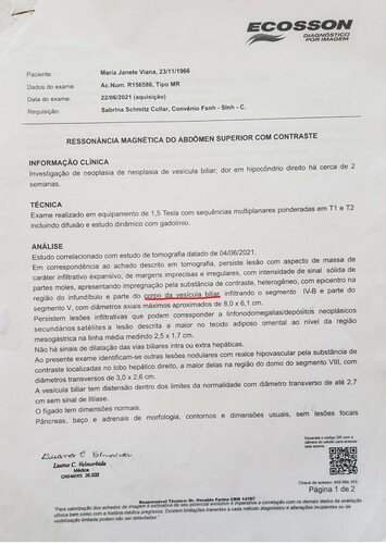 Em consulta com médico particular fui orientada a realizar o exame ONCOFOCO AMPLIADO para melhor entendimento sobre o câncer primário (vesícula biliar) e tratamento de radioterapia para o útero. Ressaltando que a remoção do útero neste caso não seria viável por ser necessário parar com a quimioterapia.