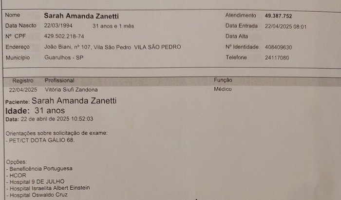 Me chamo Sarah Zanetti, tenho 31 anos e após o meu parto fui diagnosticada com câncer no figado. Esse câncer é um câncer raro que se chama neuroendócrino gastroenteropancreatico e atinge toda região do trato intestinal, além das células e hormônios por sua síndrome carcinóide. O câncer já está avançado, o fígado se encontra 13 cm maior que o normal e o pâncreas e intestino já estão lesionados. Porém, surgiu a possibilidade de um transplante, mas pra isso é necessário que eu faça um exame que não e fornecido pelo SUS e custa em média de 7 a 10 mil reais. Esse exame localiza o tumor primário, que ainda não foi encontrado e é primordial encontrá-lo, e enxerga todos os hormônios e células desreguladas, facilitando assim em mil por cento o meu tratamento. Como vocês sabem, estou desempregada e cuidando sozinha da minha neném! Por isso agradeço de coração a todos que puderem me ajudar! Deus abençoe 🙏🏻