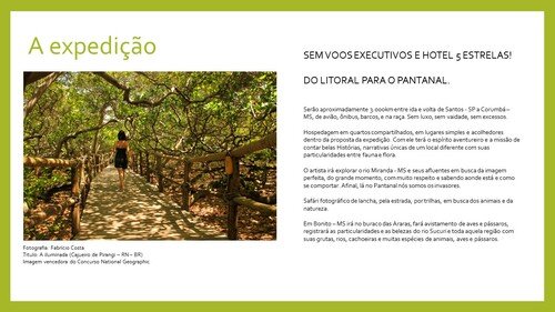 O artista irá explorar o rio Miranda - MS e seus afluentes em busca da imagem perfeita, do grande momento, com muito respeito e sabendo aonde está e como se comportar. Afinal, lá no Pantanal nós somos os invasores.