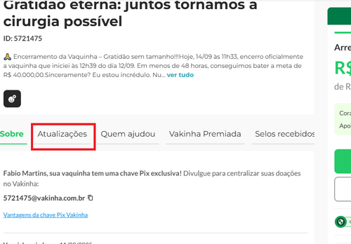 Quero aproveitar e explicar que, aqui mesmo dentro da plataforma da Vakinha, existe uma aba chamada “Atualizações”. Ali vou postar com frequência notícias sobre minha saúde, o andamento do tratamento e cada etapa dessa caminhada. Já tem alguns posts publicados lá, então quem quiser pode acompanhar diretamente por essa aba sempre que quiser se atualizar.