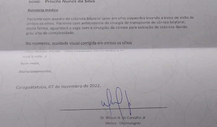 Meus problemas iniciaram em em 1996 com uma alergia que nenhum colírio resolvia; 1998 fui diagnosticada com ceratocone nos 2 olhos se agravando com o passar dos anos e deixando as córneas cada vez mais finas, eu já nao tinha mais foco na visão, era turva , enxergava como se tudo estivesse espalhado sem centralização; Em 2009 consegui realizar meu primeiro transplante no olho esquerdo e em 2018 o segundo transplante no olho direito por uma campanha no Hospital BOS em Sorocaba; 2019 descobri que estava com catarata intraocular nos 2 olhos; 2022 tive uma elevada piora nos 2 olhos, conforme exames e laudos, as celulas dos meus olhos estão diminuindo, o que causaria o olho ficar branco.