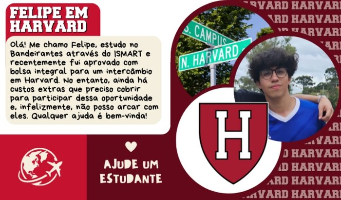 Meu nome é Felipe Pacheco dos Santos e sou um jovem bolsista no Colégio Bandeirantes. Minha motivação pelo estudo começou desde cedo, tentando criar soluções que possam ajudar a sociedade. Através do estudo no exterior, particularmente um intercâmbio na Universidade de Harvard, creio que eu poderia expandir meus horizontes e aprender com muitas pessoas de diferentes partes do mundo e também de diversas realidades.