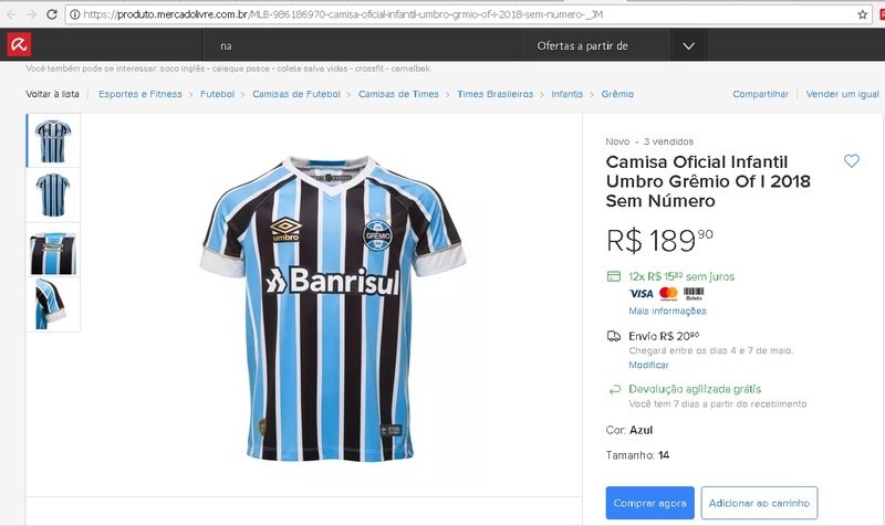 Pesquisei bastante, mas a camiseta tá em falta na maioria das lojas, ninguém manda o Grêmio estar jogando mais que a seleção, né... Enfim, achei no mercado livre um vendedor certificado e com boas referencias. O frete seria grátis, mas visto ao tempo curto até o Grenal, não será possível aguardar, então de frete sera cobrado o valor de R$ 20,90.