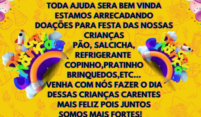 Estamos arrecadando alguns itens.- Pão- Salcicha- Molho de tomate - Pacotes de pipoca- Refrigerante - Copinho- Pratinho- Brinquedos para doação Toda ajuda sera muito bem vinda.