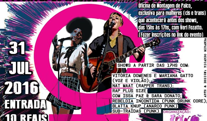A Marcha das Vadias BS agora está realizando o II Festival de Música Feminista Baderneiras, um espaço para bandas formadas por minas feministas, ainda com oficina de montagem de palco. A ideia é ter um dia de muita música com bandas e sons de, e para as minas. Um espaço aberto para bandas, formadas por mulheres ou que tenham mulheres em sua formação, se apresentarem. Este Festival tem o objetivo de dar mais visibilidade a estas bandas, priorizar o trabalho das minas, divulgar a Marcha das Vadias da Baixada Santista e arrecadar fundos para as ações da mesma. Mas como nada é tão simples, somos um Coletivo autogestionário, autônomo e autofinanciado, estamos com dificuldades para bancar todas as despesas que esta atividade demanda. Não oferecemos cachê para nenhuma banda, apenas passagens e alimentação, mas além desta despesa precisamos alugar os equipamentos de som para o evento. Os Shows acontecerão dia 31 de julho partir das 17hs com:Vitória Domenes e Mariana Gatto(Vós e Violão); Natt Maat (Rapper Trans);Rap Plus Size com Issa Paz & Sara Donato;Rebeldia Incontida (Punk Drunk Core);Sub-Traídas (Punk);Blatta Knup (Punk).Portanto precisamos muito da sua colaboração para que possamos dar andamento a este projeto.Nos ajude, colabore e apoie as ações feministas!!!Toda ajuda é válida!!!Muito obrigada a tds!!!