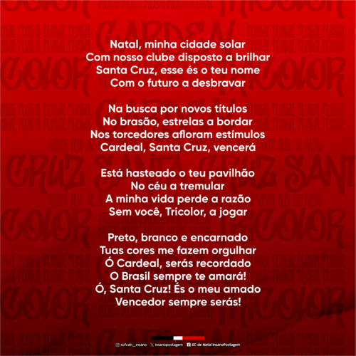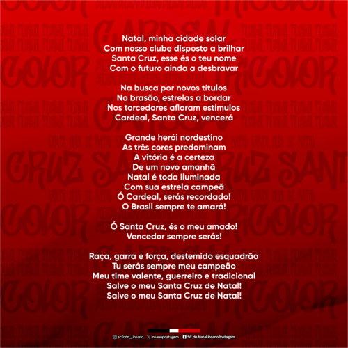 Muito prazer! Meu nome é Pedro, mas podem me chamar de Yagami, que é meu pseudônimo na internet. Sou torcedor do Santa Cruz de Natal e estou arrecadando dinheiro para produzir um novo hino para o clube por conta própria, como forma de demonstrar minha paixão. Infelizmente, não tenho recursos suficientes para contratar um estúdio musical, mas já tenho um em mente para produzir a melodia. A letra está completa, feita em parceria com outro apaixonado pelo clube, e agora estou em busca de tornar essa versão uma realidade, no estilo de marchinha de carnaval – assim como os hinos do ABC e do América, ambos de Natal e com tradição nesse formato.