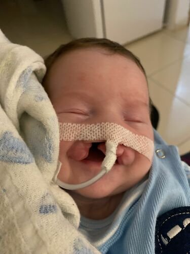 Hoje ele se encontra respirando com ajuda de aparelho pois ele tem a fenda nos dois lados sendo assim não consegue colocar a ventilação pelo o nariz, está tomando leite por sonda.